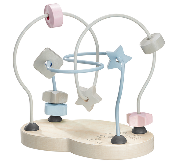 La boucle de motricité dans un design bellybutton classique sera une grande source d’amusement. Différentes pierres et étoiles peuvent être déplacées à volonté sur les deux fils, ce qui contribue ainsi à la motricité et à la réflexion spatiale.