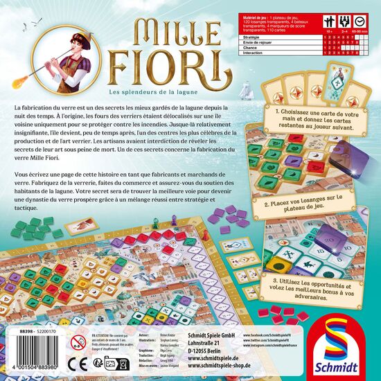 La fabrication du verre est un des secrets les mieux gardés de la lagune depuis la nuit des temps. À l’origine, les fours des verriers étaient délocalisés sur une île voisine uniquement pour se protéger contre les incendies. Jusque-là relativement insignifiante, l'île devient, peu de temps après, l'un des centres les plus célèbres de la production et de l'art verrier. Les artisans avaient interdiction de révéler les secrets de leur art sous peine de mort. Un de ces secrets concerne la fabrication du verre Mille Fiori. Vous écrivez une page de cette histoire en tant que fabricants et marchands de verre. Fabriquez de la verrerie, faites du commerce et assurez-vous du soutien des habitants de la lagune. Votre secret sera de trouver la meilleure voie pour devenir une dynastie du verre prospère grâce à un mélange réussi entre stratégie et tactique.