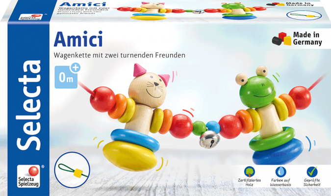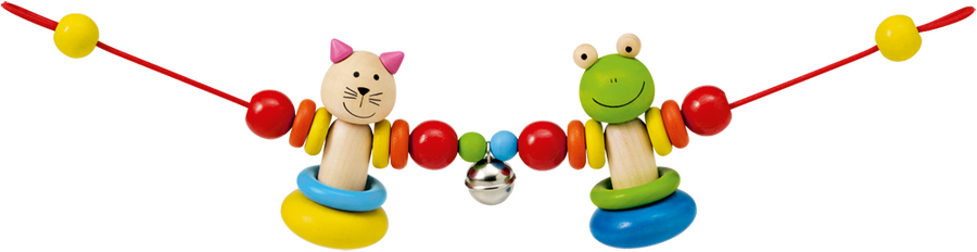 Colourful pram chain with enchanting companions for on the move: with movement, the cat and frog swing merrily back and forth and the bell jingles along. Playfully attracts the baby’s attention and encourages active grasping.