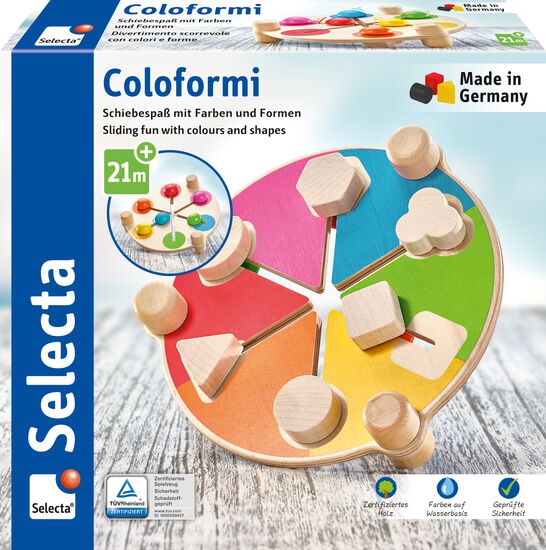 Sliding fun with colours and shapes The aim is to position the coloured buttons so that they finally match the colour marking on the disc. Done! Then we'll continue with the shapes on the second side – because everything has shifted here now! The ability to recognise and assign colours and shapes is trained playfully. Compact and versatile – therefore also ideal for on the move.