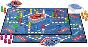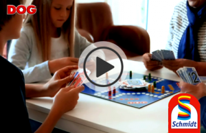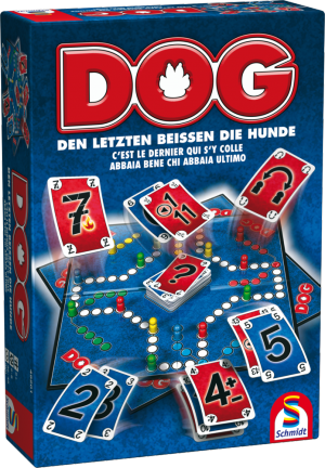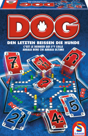 It looks like „LUDO“ (Mensch ärgere Dich nicht), but it‘s DOG! Two persons always playtogether and make up a team (exception: see special rules for 2, 3 and 5 players). All players try to move their own four pieces from home to the target area as fast as possible. Pieces are moved by cards. It is not possible to win alone. As soon as all a player’s pieces have reached the target area, hehelps his partner to move his pieces to the target area as well. The team who has first placed all its 8 pieces in the target area wins the game. Simply exhilarating and great fun!
