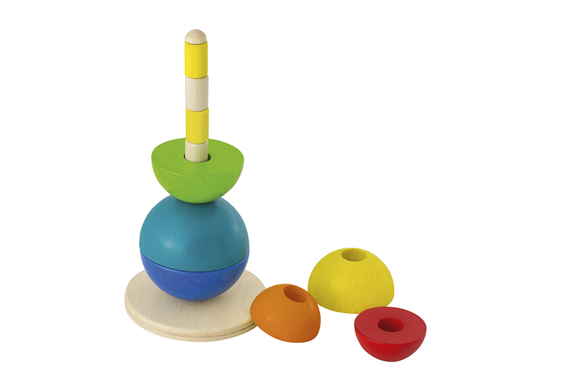 The stacking tower familiarises small children with the relationships between sizes while they play, and at the same time trains their hand-eye coordination. The six sturdy, colourful half spheres can be arranged by size or stacked in any order – both options are fascinating for small children.
