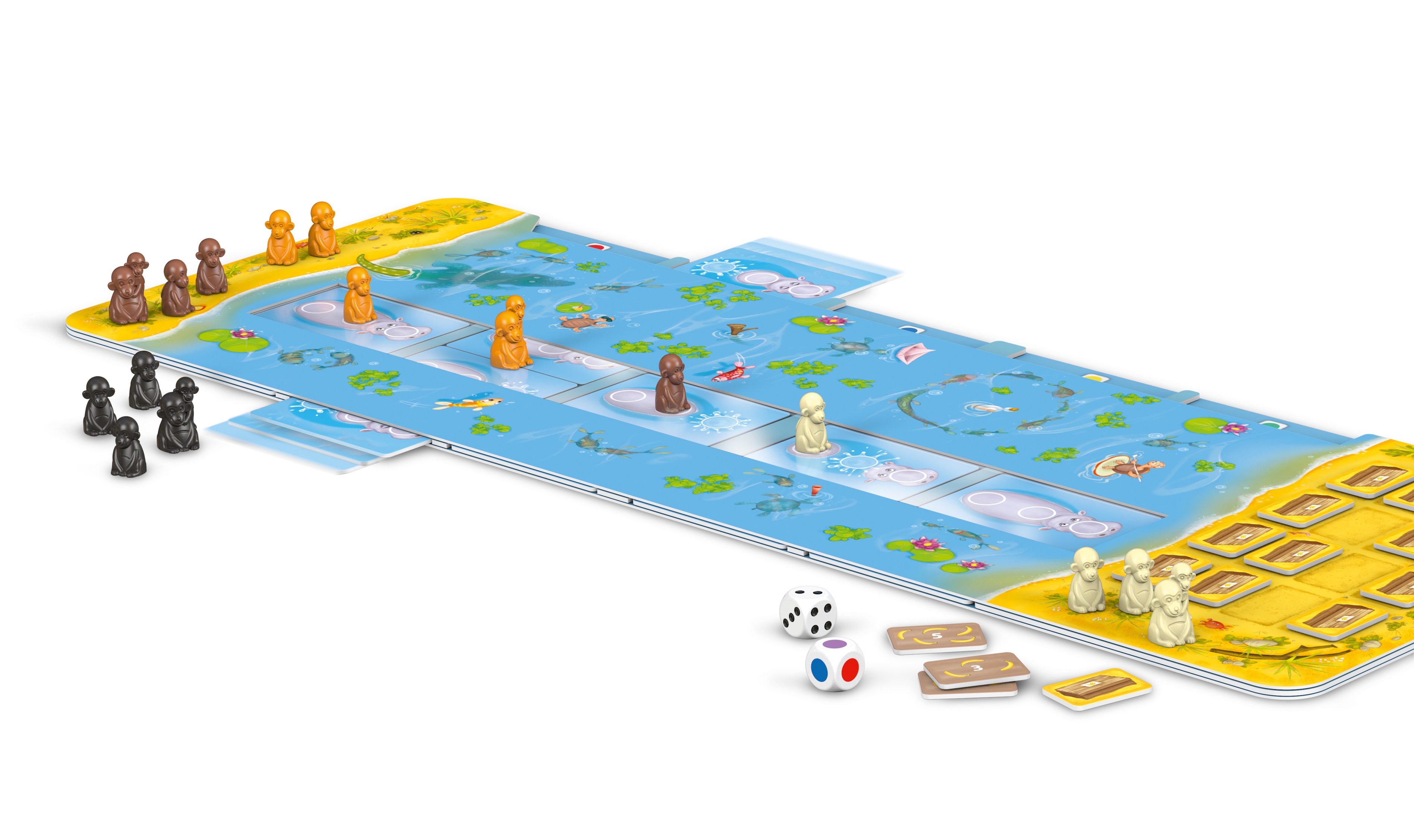 Berlin, Frühjahr 2020. Bei Schmidt Spiele® sind die Affen los – und die haben es auf die Bananenkisten auf der anderen Seite des Flusses abgesehen. Gut, dass einige Nilpferde gerade eine kleine Pause im Wasser einlegen und eine rutschige Brücke bilden...