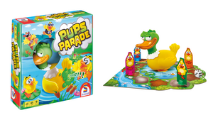 In der Spieleneuheit „Pupsparade“ von Schmidt Spiele® finden zwei bis vier Spielende ab vier Jahren mit jeweils drei Küken im heimischen Nest Platz. Damit das Ziel, der rettende Bach, erreicht werden kann, wird der Reihe nach gewürfelt und entsprechend die Spielfiguren bewegt. Doch aufgepasst! Papa Ente ist auch unterwegs und wird in jedem Zug durch seinen Drehmechanismus mitbewegt. Der Clou dahinter: Es ist nicht vorhersehbar, wo Papa Entes Rückseite stoppt und im schlimmsten Fall fegt er mit lauten Pupsen die Küken vom Spielfeld und sorgt damit für deren Rückkehr ins heimische Nest. Anhand der gewürfelten Augenzahl wird Papa Ente gedreht und wo sein Bürzel hinzeigt, fliegen die Küken vom Spielfeld. Lediglich auf den wenigen sicheren Steinen finden die Küken Schutz und können nicht weggepustet werden. Gewonnen hat die rasende Küken-Gruppe, welche als erstes vollständig im Ziel angelangt ist.