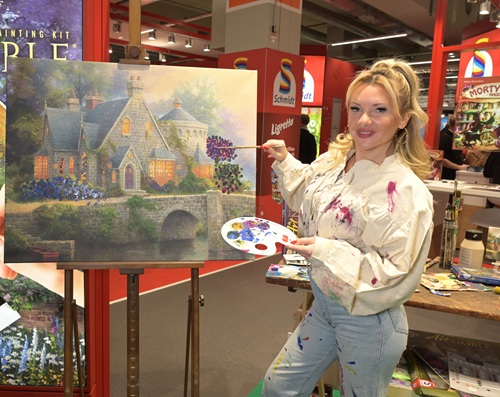 „Jetzt kann wirklich jeder zum Künstler werden“, sagt Evelyn Burdecki lächelnd, während sie die nächsten Farbtupfer setzt. Für die TV-Persönlichkeit ist das Malen ein Weg, um abzuschalten. „Ich bin sonst immer unter Strom. Beim Malen komme ich endlich runter, alles andere blendet man aus.“ Möglich macht das My ArtNOBLE®, das neue Premium-Malset von Schmidt Spiele, mit dem Evelyn auf der Spielwarenmesse® Nürnberg kreativ wird. Das Konzept ist einfach und überzeugt auch Mal-Neulinge: Jedes Set enthält alles, was man braucht, um direkt loszulegen – einen hochwertigen Pinsel, fein abgestimmte Acrylfarben, eine Mischpalette, eine Leinwand mit Motivvorlage des Künstlers Thomas Kinkade, das Originalbild als Poster sowie ein Anleitungsheft mit verständlichen Tipps und Tricks und einer Übungskarte. Schritt für Schritt-Malen, ohne Druck, aber mit jeder Menge Flow.