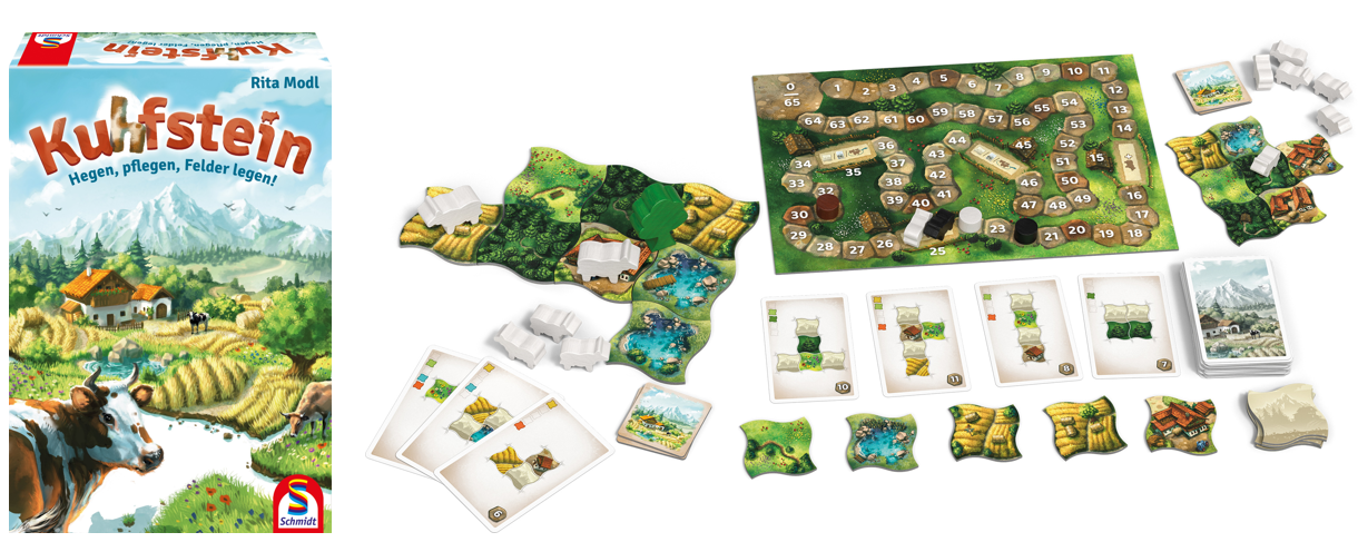 Leben in idyllischer Landschaft. In dem neuen Legespiel von Schmidt Spiele® unterstützen die Spielenden Kuhherden, indem sie die schönste Landschaft für sie legen und damit wertvolle Punkte für sich selbst sammeln. Wer die Landschaftsplättchen am schlausten kombiniert und die Kühe am besten setzt, gewinnt das Spiel, das aus der Feder von Rita Modl stammt.