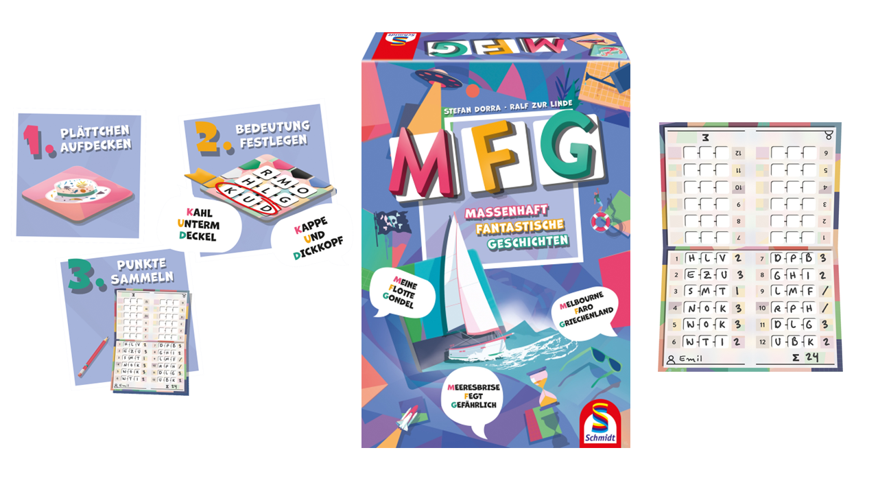 Berlin, Frühjahr 2024. MFG – Mit freundlichen Grüßen? Eher „Mit Federpfeil gleiten“ oder auch einmal „Mond Flug Gerät“. Das neue kreative Party- und Kommunikationsspiel mit assoziativem Merkcharakter von Schmidt Spiele® wird „mit Fun gefüllt“, wenn sich die Spielenden gemeinsam prägnante Wortassoziationen zu Bildern ausdenken und diese später punktreich aus dem Gedächtnis abrufen wollen. Dann zeigt sich, wie passend die gewählten Begriffe waren.