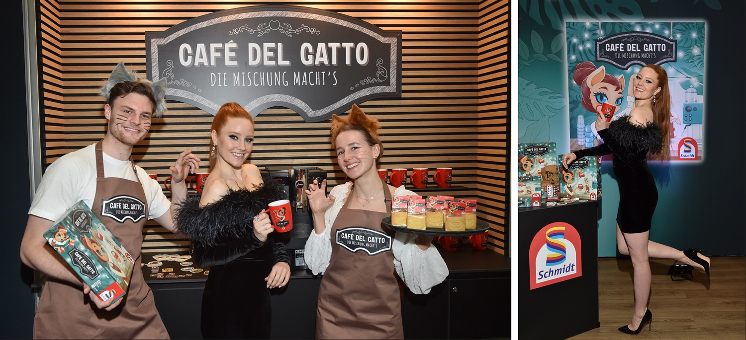 Berlin/Nürnberg, 31. Januar 2023. Showtime im „Café del Gatto“! Schmidt Spiele und Gastgeberin Barbara Meier luden auf der PressPreview der diesjährigen Spielwarenmesse® Nürnberg zur stilvollen Kaffeezubereitung. Das bekannte Topmodel präsentierte das „Café der Katzen“ und performte einen coolen Catwalk – begleitet von zahlreichen Kaffeekreationen der schnurrenden Baristas. Denn im neuen Genussspiel mit „Miau-Effekt“ für die ganze Familie werden besonders talentierte Kaffeezubereiter:innen gesucht. Für Barbara Meier war es der erste Catwalk-Auftritt nach der Geburt ihrer zweiten Tochter im November letzten Jahres.