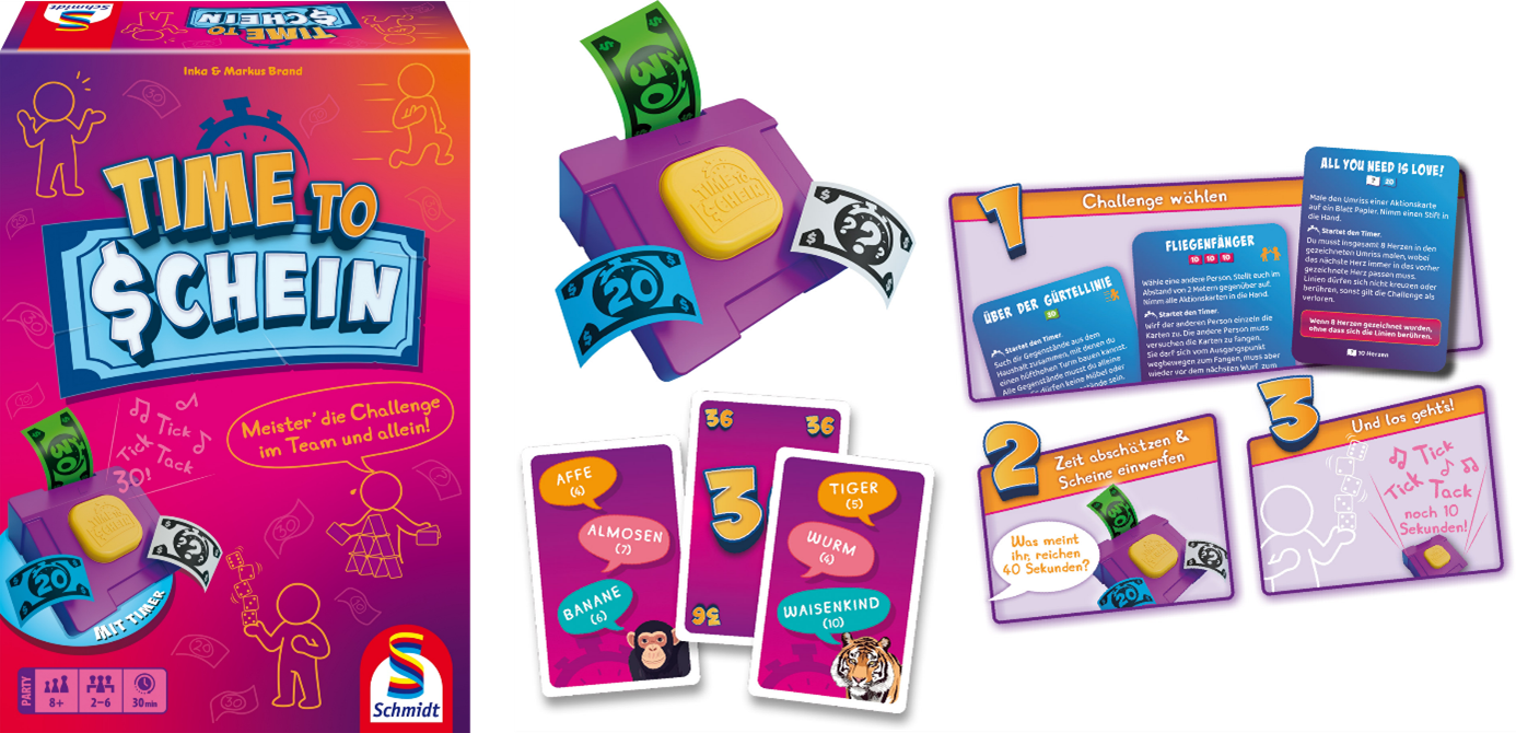 Berlin, Frühjahr 2026. Jetzt heißt es gut abschätzen und keine Zeit verschwenden: „Time to Schein“ ist das neue turbulente, kooperative Partyspiel von Schmidt Spiele, bei dem Zeit wortwörtlich bezahlt wird. Gemeinsam stellt sich das Team verrückten, sportlichen oder kniffligen Herausforderungen und muss zuvor entscheiden, wie viele Sekunden es dafür benötigt. Der Clou: Der smarte Timer wird jede Runde mit Geldscheinen versorgt, welche der geschätzten Zeit entsprechen, bevor es heißt: „Time to Schein“!
