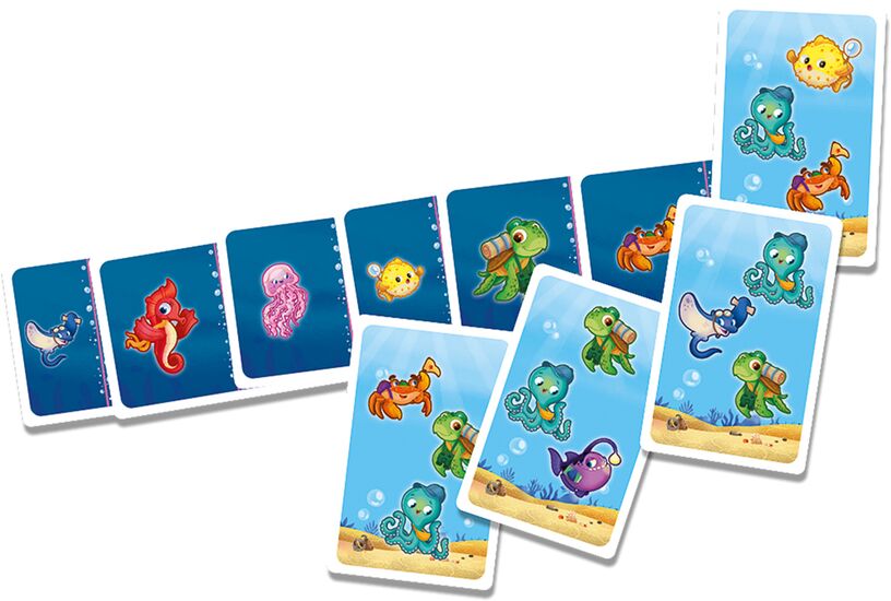 Blubb, blubb, blubb…. Unter Wasser ist so einiges los! Auf jeder Karte tummeln sich drei lustige Meeresbewohner. Könnt ihr eure Karten so ablegen, dass auf allen vier Stapeln das gleiche Tier zu sehen ist? Mit einer guten Mischung aus Glück und cleverem Kartenablegen könnt ihr punkten, Wertungskarten für eure Tierreihe sammeln und am Ende mit der längsten Reihe gewinnen.
