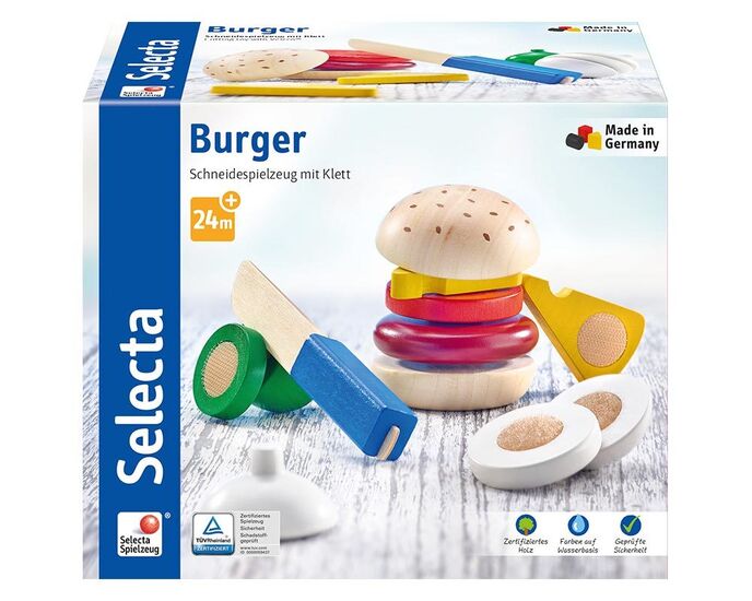 Leckere und gesunde Burgerkompositionen können von den kleinen Köchen selbst zubereitet werden. Alle Teile lassen sich dank des Kletts leicht mit dem Messer schneiden und können beliebig angerichtet und aufgetürmt werden. Wer schafft den höchsten Burger? Das Schneidespielzeug fördert motorische Fähigkeiten und ist ideal für erste Rollenspiele.