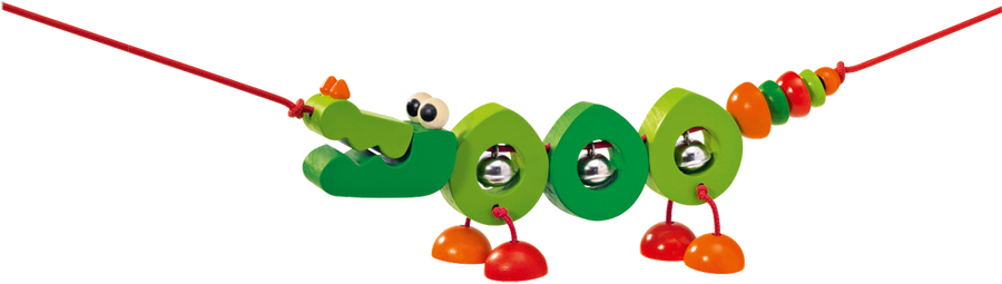 Das Krokodil reckt sich und streckt sich über die ganze Wagenbreite. Ein fröhlicher Begleiter bei jedem Spaziergang.