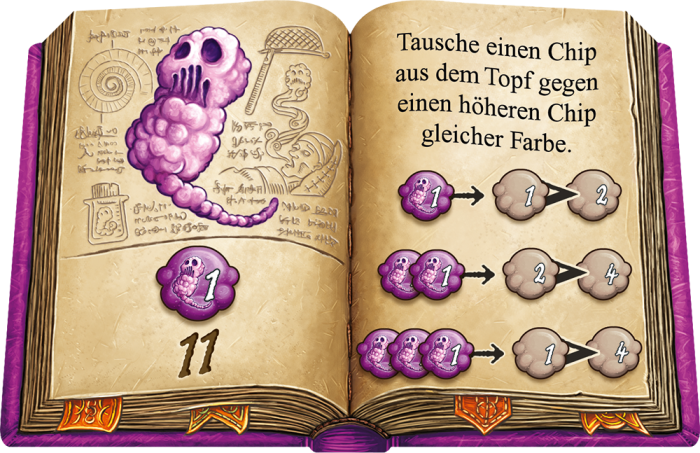 Jeder der bis zu vier mitspielenden Quacksalber kocht hier sein eigenes Süppchen. Zutat um Zutat wird hierfür aus dem eigenen, im Laufe des Spiels selbst zusammengestellten Vorratsbeutel gezogen. Doch Obacht: eine Prise zu viel von den Knallerbsen und die ganze Mischung ist verdorben. Da heißt es geschickt zur rechten Zeit aufhören und lieber nur ein kleineres Portiönchen kochen, um mit den hierfür gewonnenen Erträgen noch wertvollere Zutaten zu erwerben. Dann wird der nächste Trank sicher noch besser munden und viele wertvolle Siegpunkte einbringen.