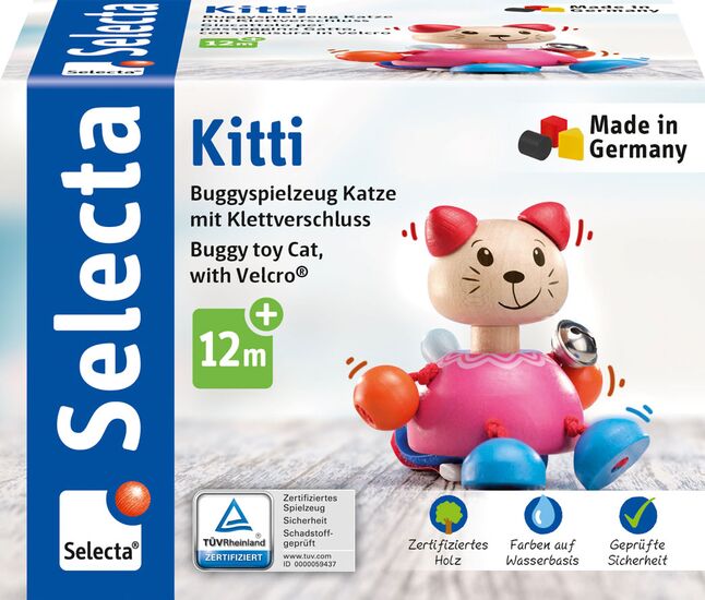 Die niedliche Katze freut sich, wenn sie bei der Ausfahrt gedrückt und bespielt wird. Bei jedem festen Druck auf den Kopf ertönt ein freudiges Quietschen. Mit Klettband für eine einfache und sichere Befestigungsmöglichkeit an Buggy und Kinderwagen. Für Unterhaltung sorgen ein Glöckchen und die eingebaute Hupe.