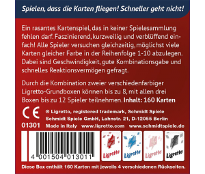 Ligretto®, das rasante Kartenspiel, das in keiner Spielesammlung fehlen darf. Jetzt im neuen Design! Geschwindigkeit, gute Kombinationsgabe und schnelles Reaktionsvermögen sind hier gefragt. Faszinierend, kurzweilig und verblüffend einfach!