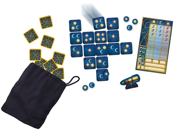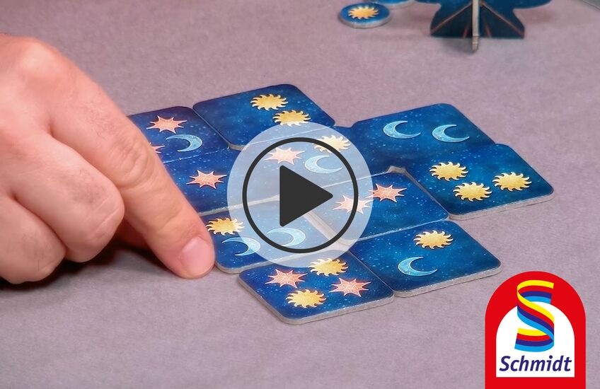 LUMINOS ist ein himmlisches Plättchenlegespiel, mit einfachen Regeln, aber kniffligen Entscheidungen. Jede Runde legst du ein Plättchen in deine Auslage. Sobald du ein Quadrat mit vier Plättchen vervollständigst, wird gewertet. Jedoch zählt nur das Symbol, welches am wenigsten vertreten ist. Werte dabei aber möglichst alle Symbole gleichmäßig, denn am Ende bekommst du die Siegpunkte nur für vollständige Sets aus Sonnen, Monden und Sternen.
