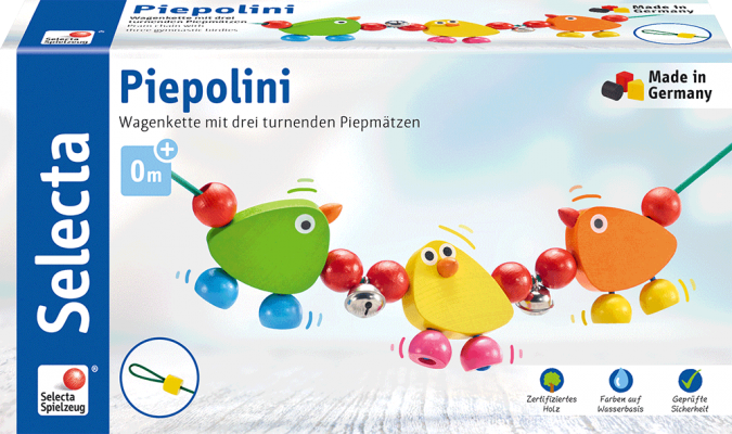 Ein Schmuck für jeden Kinderwagen ist farbenfrohe Wagenkette mit den drei fröhlichen Piepmätzen. Babys Langeweile ist wie weggeblasen, wenn die drei frechen Vögelchen bei jeder Bewegung des Kinderwagens loszuflattern scheinen und die kleinen Glöckchen dazu leise bimmeln.