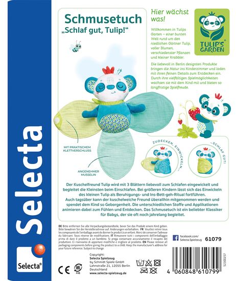 Der Kuschelfreund Tulip wird mit 3 Blättern liebevoll zum Schlafen eingewickelt und begleitet die Kleinsten beim Einschlafen. Bei größeren Kindern lässt sich das Einwickeln des kleinen Tulip als Beruhigungs- und Ins-Bett-geh-Ritual fortführen. Auch tagsüber kann der kuschelweiche Freund überallhin mitgenommen werden und spendet dem Kind so Geborgenheit. Die unterschiedlichen Stoffe und Applikationen animieren dabei zum Fühlen und Entdecken. Das Schmusetuch ist ein beliebter Klassiker für Babys, der sie oft noch jahrelang begleitet.