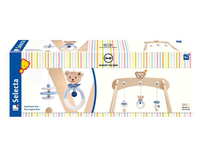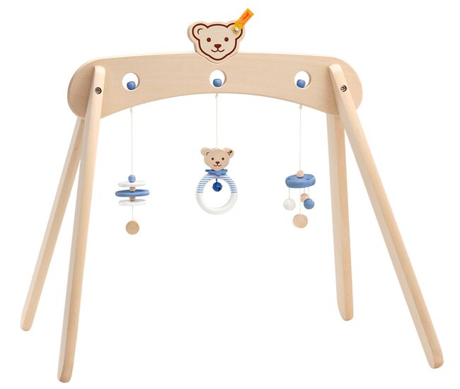 Stabiles Spieltrapez aus Massivholz: Mit viel Freude tanzt der kleine Bär, wenn er angeschubst wird. Die drei Anhänger sorgen dafür, dass keine Langeweile aufkommt.