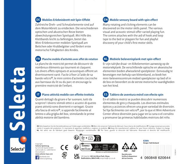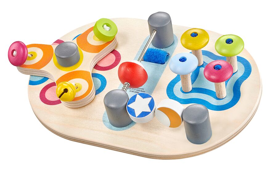 Auf dem Motorikbrett gibt es viele spannende Dreh- und Schnalzelemente zu entdecken. Die unterschiedlichen visuellen und akustischen Eindrücke sorgen für abwechslungsreiche Unterhaltung. Dank des praktischen Klettbands lässt sich das Mini-Erlebniscenter einfach befestigen und bietet mobiles Spielvergnügen am Bettchen oder im Laufstall. Es unterstützt zudem die Entwicklung der ersten motorischen Fähigkeiten des Kindes und ist perfekt für unterwegs.
