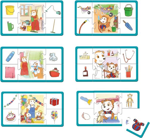 Was gehört wozu? Die Kinder helfen Bobo Siebenschläfer die passenden Gegenstände für verschiedene Alltagssituationen zu finden. Wer hat sein Tableaus zuerst vervollständigt?