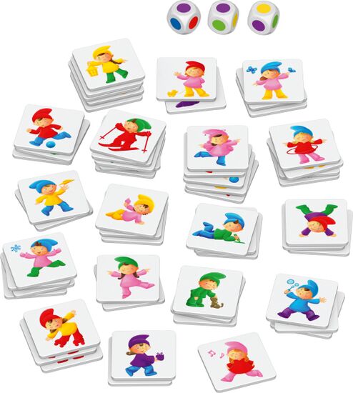 56 lustige Zwerge möchten mit euch spielen. Würfelt die drei Farbwürfel und schaut genau: Wer findet zuerst den Zwerg, dessen Kleidung der gewürfelten Kombination entspricht? Ein kunterbuntes Such-und Reaktionsspiel mit einfachen Regeln, bei dem auch schon kleine Zwergenfreunde großen Spaß haben.