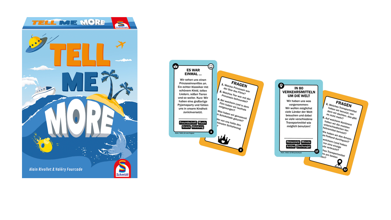 Berlin, Frühjahr 2024. 50 lustige, spannende, abenteuerreiche und überraschende Situationen – jede Runde wird eine davon laut vorgelesen und von den Spielenden in 120 Sekunden mit fantasievollen, verrückten oder auch alltäglichen Details ausgeschmückt. Dabei lautet das Credo: „Tell Me More“. Je mehr Details gesponnen werden, desto besser ist die Gruppe für die heiße Phase gewappnet. Denn die Rückseiten der Karten enthüllen knifflige Fragen, welche die Gruppe gleichzeitig und am besten auch noch gleich beantworten muss – ohne sich dabei abzustimmen. Je mehr übereinstimmende Antworten abgegeben werden, desto mehr Punkte erhalten die Spielenden. Eine Spieleneuheit, die überall gespielt werden kann und bei welcher der Schöpferkraft keinerlei Grenzen gesetzt sind.