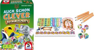 Schmetterlinge flattern durch die Luft, der Affe sammelt Kokosnüsse und der Elefant sprüht Wasserfontänen: Bei „Auch schon clever – Dschungelparty“ begeben sich zwei bis vier Personen ab sechs Jahren auf Punktejagd im Regenwald. Ziel ist es, durch kluges Ankreuzen und geschicktes Kombinieren der Würfel möglichst viele Regenbogensterne zu sammeln. Gespielt wird mit fünf Würfeln, die diesmal Symbole aus der Dschungelwelt auf unterschiedlich gefärbten Hintergrundflächen zeigen. Um ein Symbol im entsprechenden Farbbereich auf dem eigenen Block ankreuzen zu dürfen, müssen nun teils mehrere Würfel passend kombiniert werden – eine neue knifflige Herausforderung. Die übrigen Spielenden nutzen die verbleibenden Würfel, sodass auch in dieser Variante keine langen Wartezeiten entstehen. Das Spiel endet, wenn eine Person in einem Farbbereich den blau umrandeten Stern umkreist hat und am Ende gewinnt, wer die meisten Sterne erspielt hat.